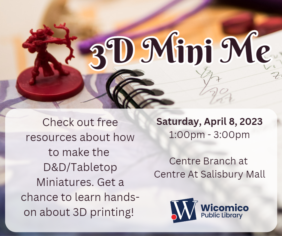 Check out information and free or inexpensive resources about how to find and make the digital files to make D&D/Tabletop Miniatures. Get a chance to learn hands-on about 3D printing and its application with miniatures. We are unable to use the Mobile Learning Lab for this program, so it will be held inside the Centre Branch of the library.