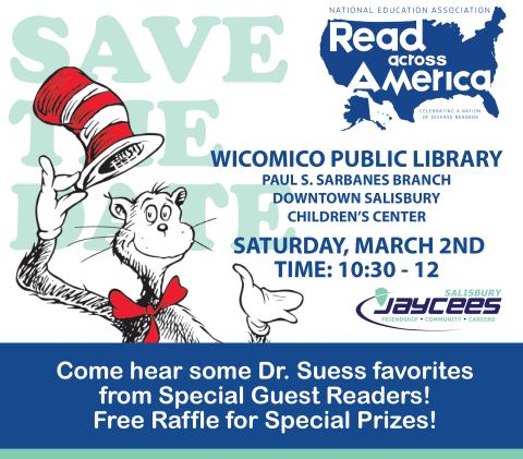 Join us for a celebration of Dr. Seuss's birthday with the Salisbury Jaycees. Children will have the opportunity to listen to stories from special guest readers! There will also be a free raffle for special prizes.