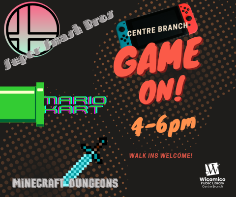 Challenge a friend and come play at Centre Branch! Mario Kart, Super Smash Bros, Minecraft Dungeons and more. Show your competitive streak, and let's Game On! Each Game On event will feature a different game.