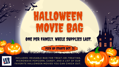 Starting October 21st, visit the Paul S. Sarbanes Branch to pick up your Halloween Movie bag. Each bag includes a reusable bag for trick-or-treating, microwave popcorn, assorted candy, and a curated list of our favorite Halloween movies.