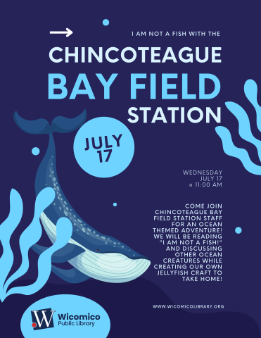 Come join Chincoteague Bay Field Station staff for an ocean themed adventure! We will be reading "I am not a Fish!" and discussing other ocean creatures while creating our own jellyfish craft to take home!