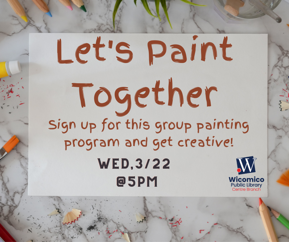 Let's paint together! Join us at 5pm for a creative painting session. We will provide paints, brushes, and a canvas with an outline even novice artists can fill with color.