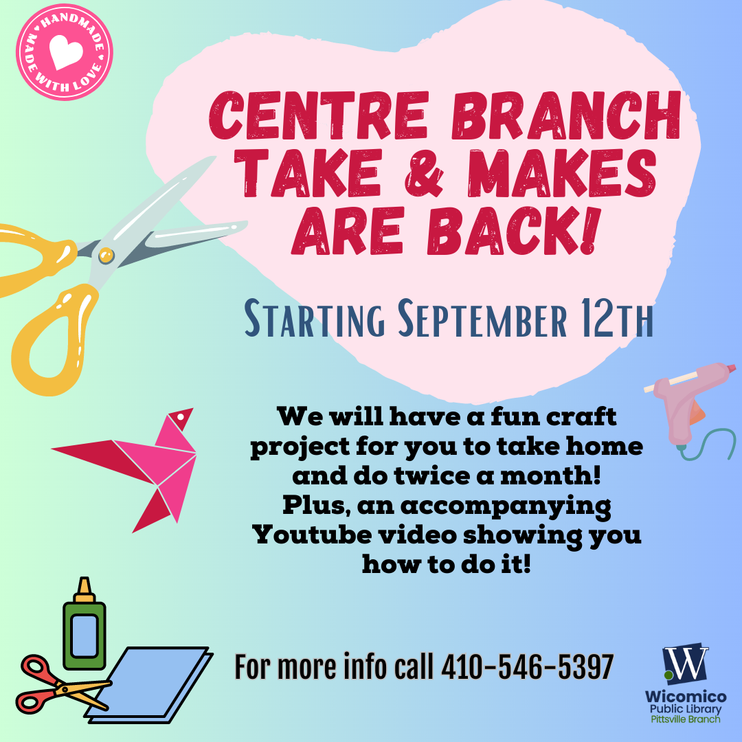 They're Back! Come pick up a Take & Make kit featuring a cool craft, then watch our Youtube video to see how it's done. This week's craft is (TBD). Available while supplies last.